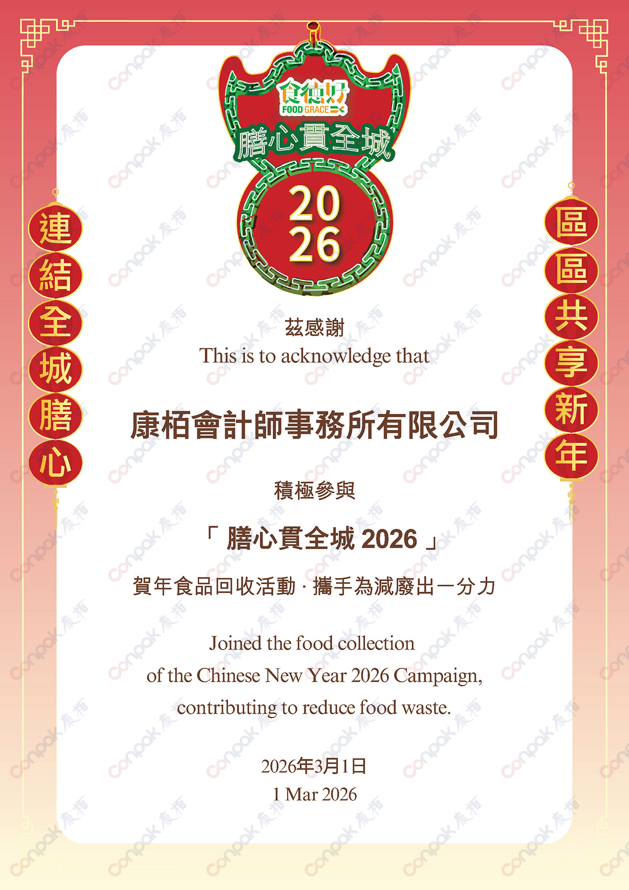 康栢信守对社会的承诺,致力成为负责任的企业公民,通过多种形式为社会公益尽力。慈善、环保、义工服务、关怀员工是康栢履行社会责任的重点。此外,康栢亦发挥专业优势,为慈善机构提供免费审计服务。